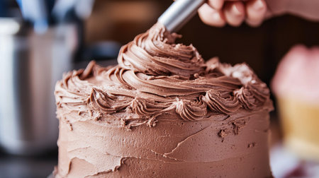 A close-up view of a cake being decorated with rich chocolate frosting using a piping technique in a bright kitchen ambiance. Perfect for baking enthusiasts.