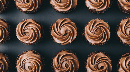 A clean presentation of chocolate cupcakes with piped frosting, arranged symmetrically on a light background.