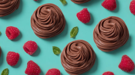 A visually captivating display of creamy chocolate mousse swirls accompanied by fresh raspberries and mint leaves, perfect for enticing dessert lovers and enhancing presentations.
