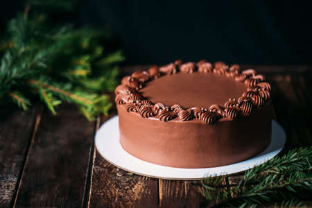 Chocolate cake on a white plate. Against the background of a branch of a Christmas tree. Wooden table with a beautiful pattern. Traditional sweets for birthday and other holidays.