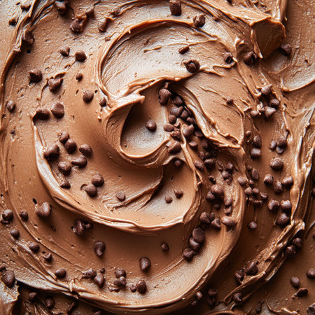 A close-up view of creamy chocolate frosting, showcasing rich, smooth textures and delightful swirls that inspire baking and dessert creativity.