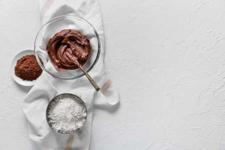Top-down perspective of a rich chocolate paste spread across a plain background. Ideal for sweet treat and dessert photography.