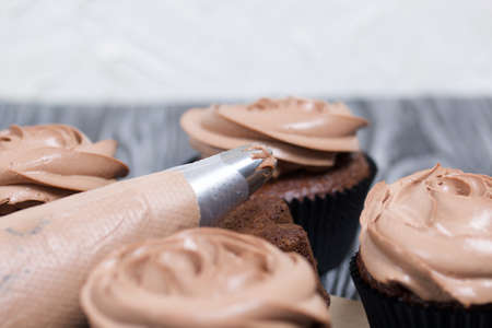 Chocolate cupcakes with cream cheese cream. Next to it is a pastry bag with cream for decoration.