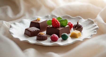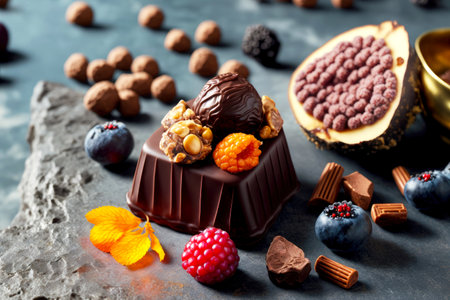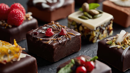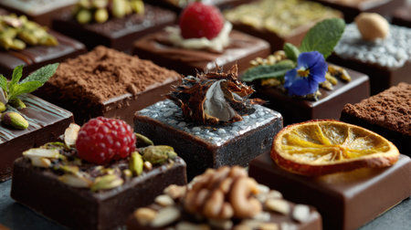 Delight in a variety of gourmet chocolates adorned with fresh fruits, nuts, and edible flowers, perfect for any celebration or upscale event.