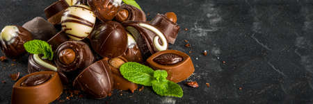 Beautiful Creative Chocolate Sweets on Natural Black Stone Background. Mix of Chocolates Top View and Flat Lay
