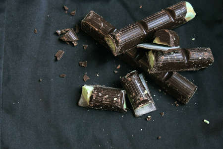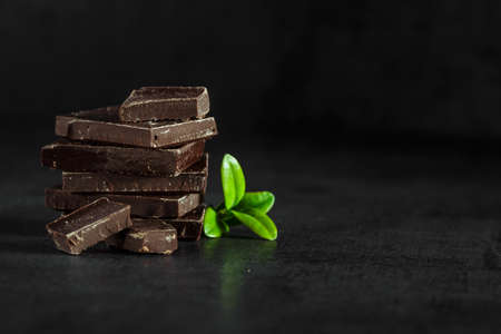 Black chocolate, mint leaf on a dark background