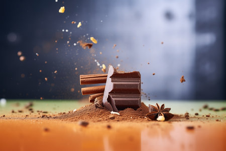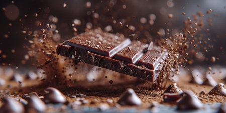 Messy burst of shattered chocolate with crumbs and cocoa dust against pitch-black fabric