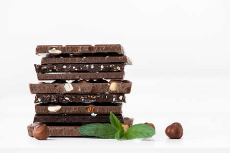 Stack of chocolate slices with mint leaf on a wooden table. Assortment of fine chocolates in white, dark, and milk chocolate. Sweet food photo concept.