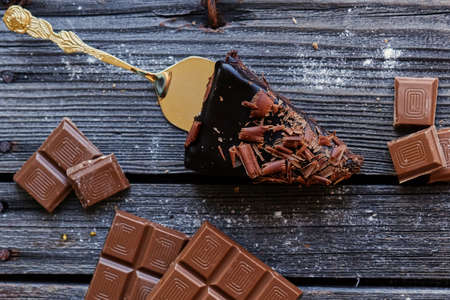 Brown milk chocolate on a wooden table.