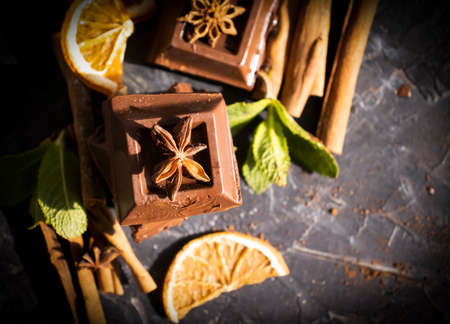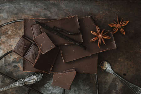 Top view. Chocolate bar. Dark chocolate on a dark background with spices. Anise.