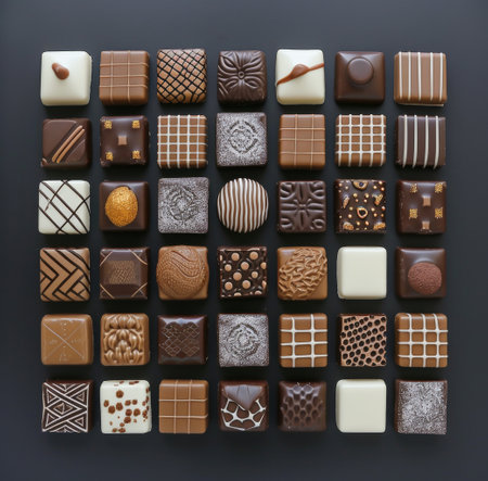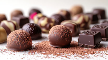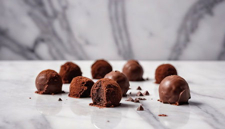 Explore a stunning arrangement of assorted gourmet chocolate bites featuring rich flavors and artistic decorations on a marble surface. Perfect for events.