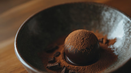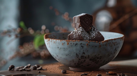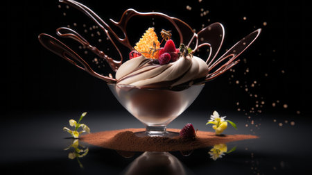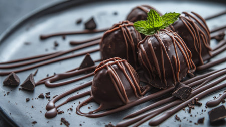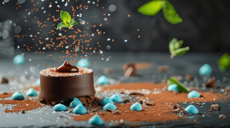 A stunning chocolate dessert garnished with fresh mint, sprinkled with cocoa dust, captures the essence of indulgence and creativity in culinary art.