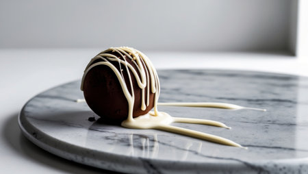 Close-up of chocolate truffle with decorative swirls on white background