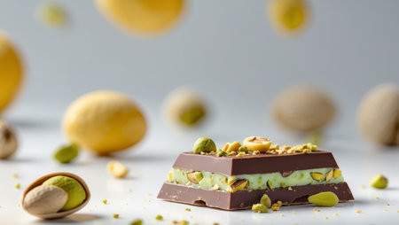 AI Generated. Chocolate Bar with Pistachio Filling and Nuts Close Up