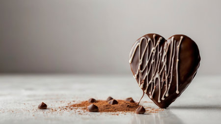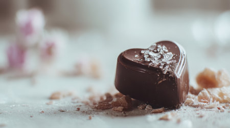 This close-up image showcases a heart-shaped dark chocolate adorned with sea salt, set on a rustic table. Perfect for romantic occasions and culinary inspiration.