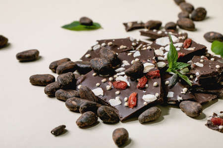 Handmade chopped dark chocolate with different superfood additives seeds and goji berries, with cocoa beans and fresh mint over beige background.