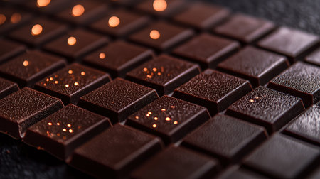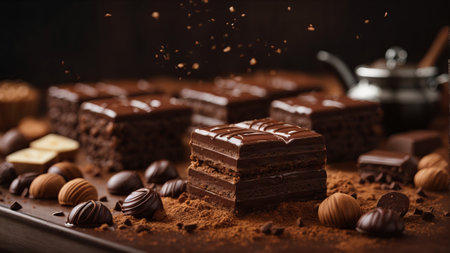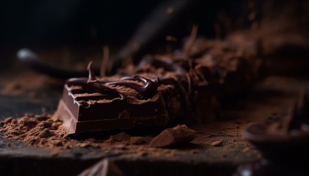 Delicious chocolate square on a dark background with cocoa accents
