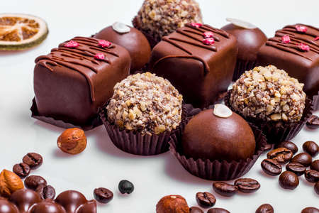 Chocolate bars and chocolates on a white background