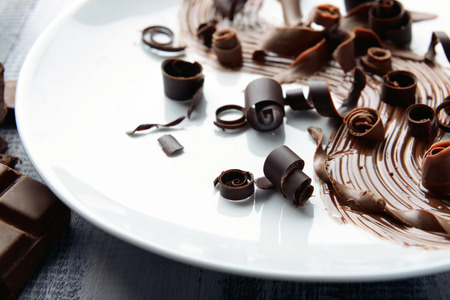 Curls and pieces of tasty chocolate on white table
