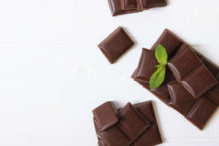 Pieces of dark chocolate on a light background