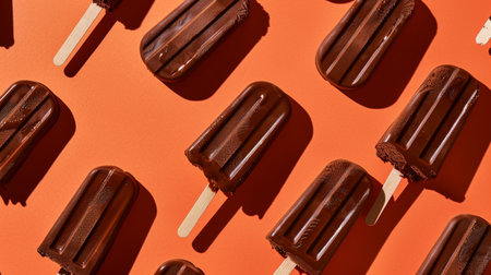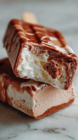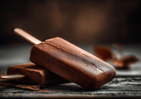 Two rich chocolate ice cream bars rest on a rustic wooden surface.