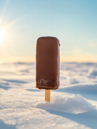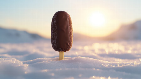 A chocolate ice cream bar is sticking out of the snow as the sun sets, creating a striking contrast against the winter landscape.