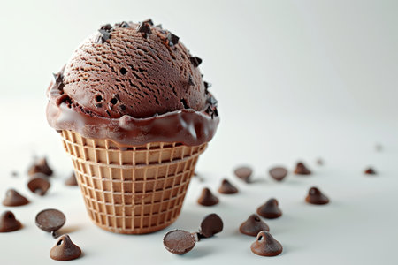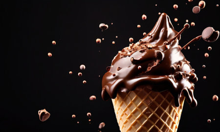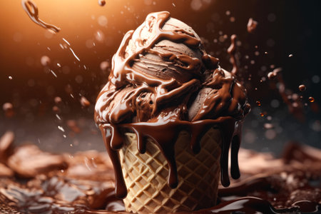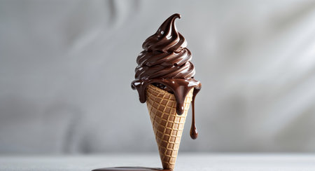 A stunning chocolate ice cream cone topped with creamy chocolate swirl and dark chocolate chunks cascading down, enticing dessert lovers with its rich, decadent appeal.