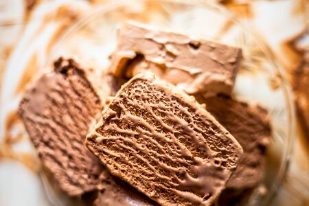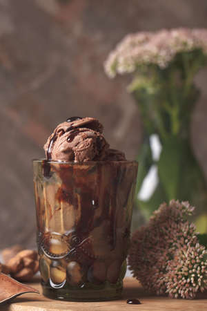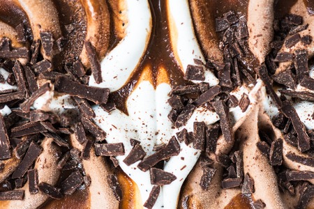 Chocolate ice cream. Ice cream with caramel and chocolate. Close up ice cream