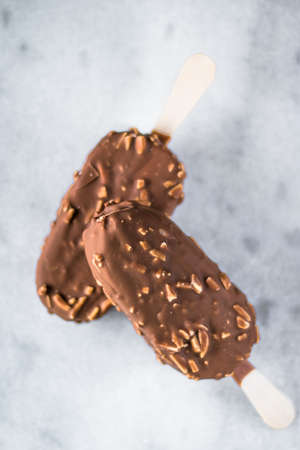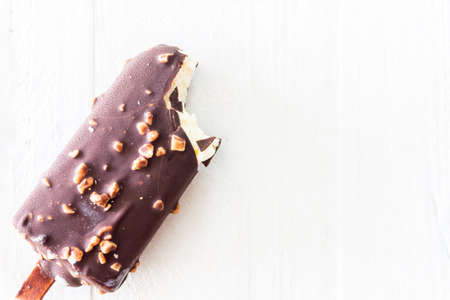 Ice cream bar vanilla covered with chocolate and nut in hand