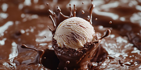 A mouthwatering scoop of chocolate ice cream evokes indulgence as it splashes into a pool of rich chocolate sauce against a striking red backdrop. Perfect for food lovers!