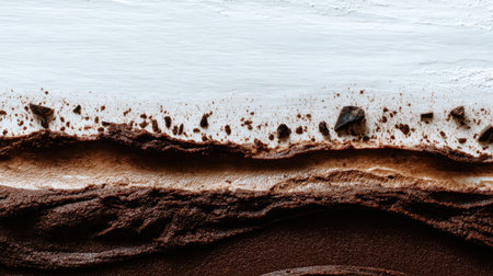 This captivating image features an abstract texture of rich chocolate spread layered with a creamy white topping and crushed ingredients, perfect for food lovers.