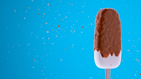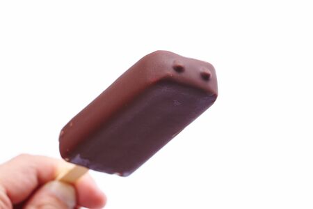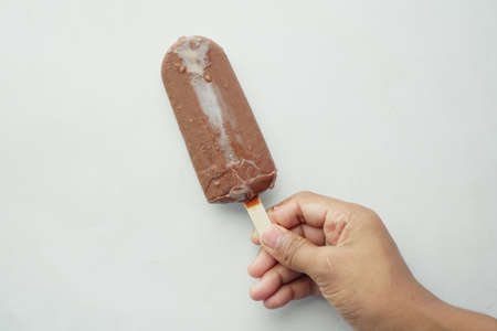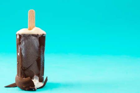 Woman's hand holding chocolate ice cream stick with blue colors background