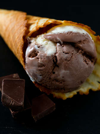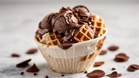 Rich chocolate ice cream waffle cone. Generative AI image.