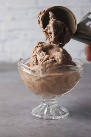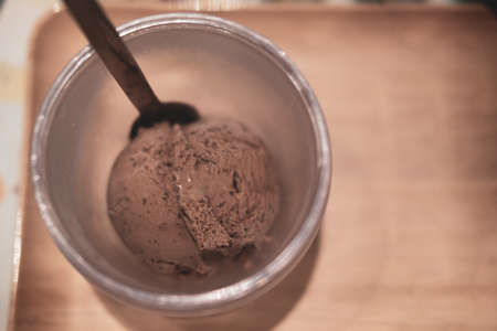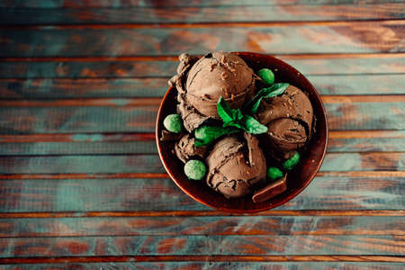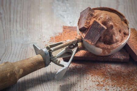 Scoop of chocolate ice cream on rustic wooden background. Selective focus