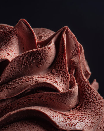 macro shot of a chocolate ice cream surface with tiny air pockets and swirls, studio black background and side light v 7, Generative AI