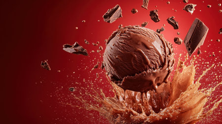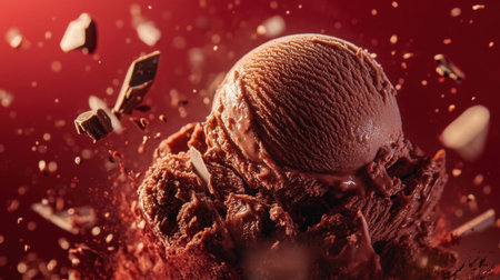 This visually striking image features a rich chocolate ice cream scoop with flying cocoa chunks, creating a dynamic culinary scene that captures the essence of indulgence and flavor.
