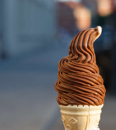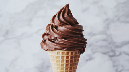 A close-up view of a luscious chocolate ice cream cone, showcasing its rich texture and delightful swirl. Perfect for dessert and food photography.