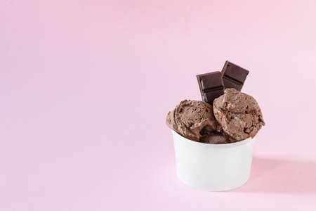 Scoops of chocolate ice cream in a paper mug on pink background. Ice cream take away. Refreshing summer dessert.