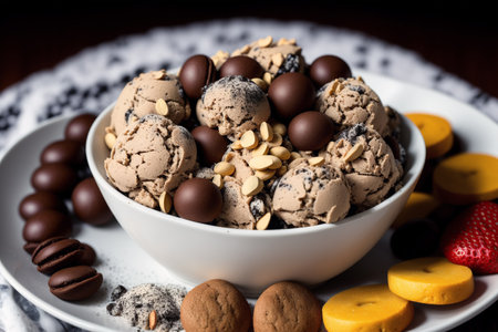Homemade chocolate ice cream balls with chocolate candies and nuts in a bowl