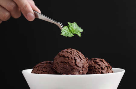 Three scoops of dark cacao ice cream sundae sprinkled with chocolate with mint leaves and spicy coated green peanuts