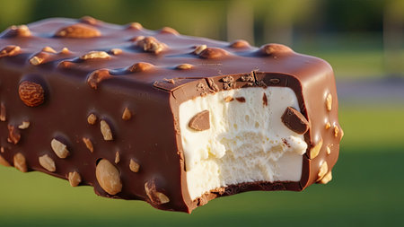 A detailed image showcases a partially eaten ice cream bar coated in chocolate and nuts. The texture of the chocolate and the nuts is clearly visible, contrasting with the creamy white ice cream. The composition utilizes a shallow depth of field, with a blurred green background, suggesting outdoor lighting, suitable for various commercial uses.