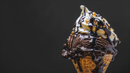 Chocolate ice cream cone with melted chocolate sauce drizzling background, delicious dessert concept