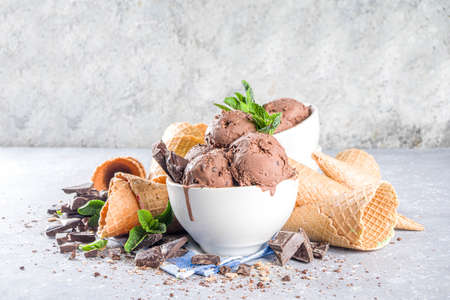 Homemade chocolate ice cream with chocolate pieces and shavings, and ice cream cones. In small white bowls on white grey stone table copy space