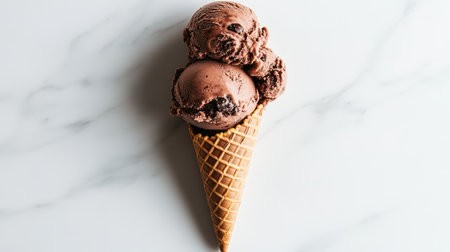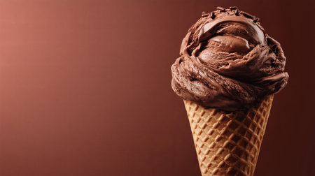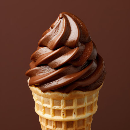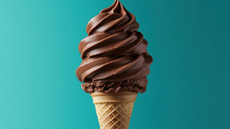 Enjoy a tempting close-up of a rich chocolate ice cream cone with a smooth swirl. Perfect for showcasing dessert treats and summer delights.