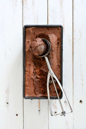 Chocolate ice cream on a white wooden background