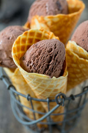 Cold chocolate ice cream made of dark chocolate pieces. Chocolate ice cream cone.