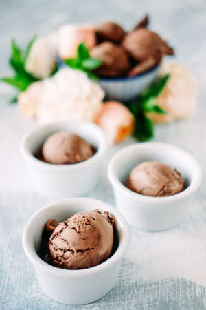 Chocolate ice cream in a white bowl. Selective focus.