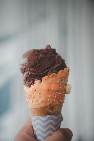 Hand holding chocolate ice cream cone with abstract background