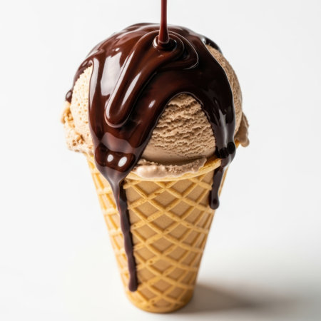 Ice cream cone with chocolate sauce isolated on white background