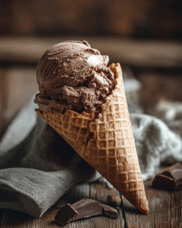 a scoop of chocolate ice cream in a waffle cone, placed on a wooden table in soft afternoon light, rustic and cozy mood v 7, Generative AI